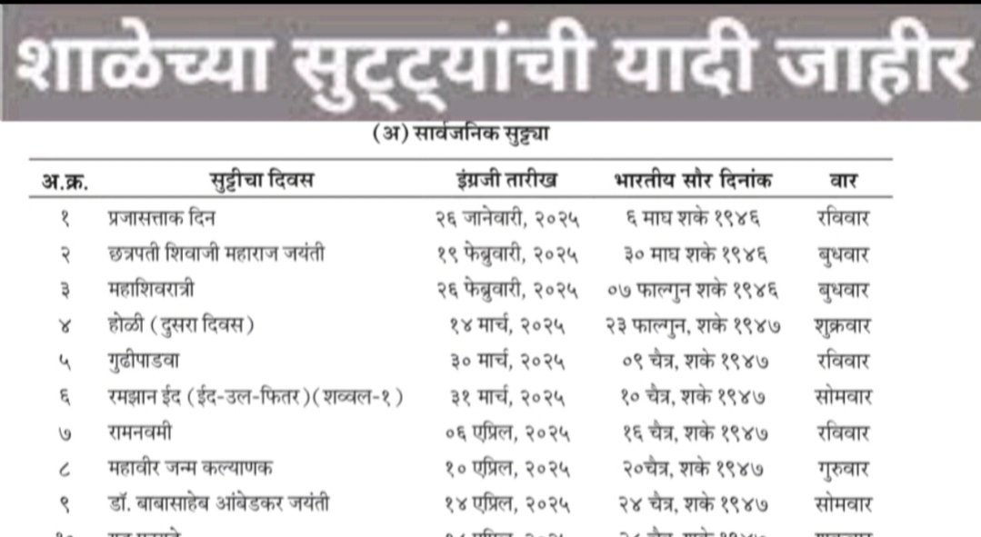 या सुट्ट्यांमध्ये शासन निर्धारित 20, विभागीय आयुक्त निर्धारित 3 व मुख्याध्यापक स्तरावरील 2 सुट्यांचा समावेश आहे. सरकारच्या नियोजनानुसार उन्हाळी सुट्या 2 मे ते 14 जून, दिवाळी सुट्या 28 ऑक्टोबर ते 12 नोव्हेंबरपर्यंत असतील.